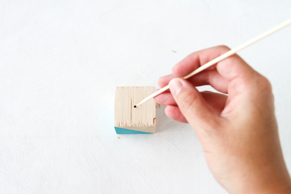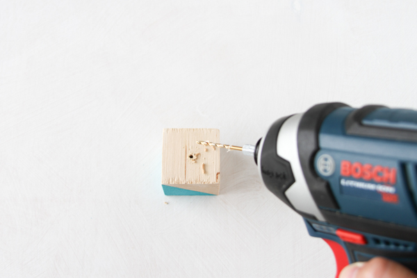 Turn your blocks over and drill a hole in the center of the block, drilling roughly 1/2 to 3/4 of the way down though the block. The exact measurement will depend on how large the block is that you are drilling into. It is important to note, you do not want to drill all the way through the block.